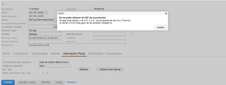 El sistema muestra el mensaje de advertencia “No se pudo obtener CAE de exportación. Si está autorizando una NC / ND comprobante de servicio (Tipo=2) el campo cmp.cmps_asoc es de carácter obligatorio." a la hora de obtener CAE de una nota de crédito/débito de exportación.