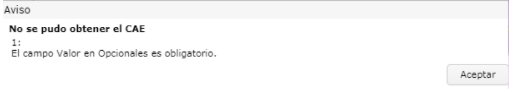 El sistema muestra el mensaje de advertencia “No se pudo obtener el CAE
