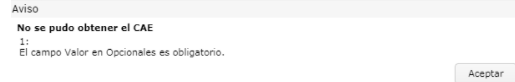 El sistema muestra el mensaje de advertencia “No se pudo obtener el CAE 1: El campo valor en opcionales es obligatorio.” cuando se intenta emitir una nota de la normativa de factura de crédito electrónica.