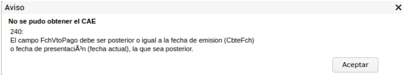 240: El campo FchVtoPago debe ser posterior o igual a la fecha de emisión (CbteFch) o fecha de presentación (fecha actual), la que sea posterior.” cuando se intenta obtener CAE de un documento.