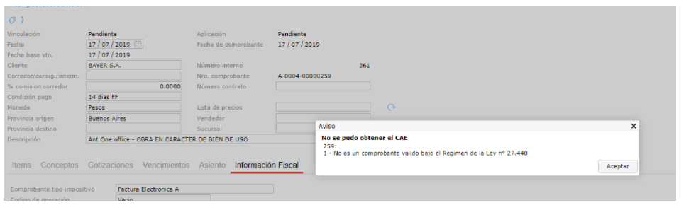 259: 1 - No es un comprobante válido bajo el régimen de la ley 27440 ” cuando se intenta emitir una factura electrónica.