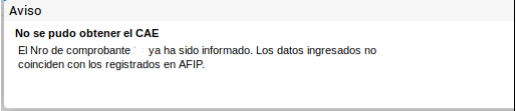 El mensaje de advertencia se genera debido que ya se obtuvo CAE con ese número de comprobante en ese punto de venta. También puede que haya distintos datos en el documento a obtener CAE que en el original ya informado.