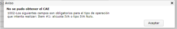 1002-Los siguientes campos son obligatorios para el tipo de operación que intentan realizar: Ítem #1: alícuota IVA o tipo IVA Nulo-” cuando se intenta obtener CAE de un documento.