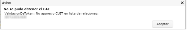 El sistema muestra el mensaje de advertencia “No se puede obtener CAE: ValidacionDeToken: No apareció CUIT en lista de relaciones”