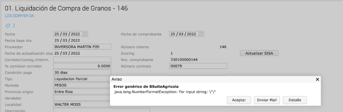 Consulta: El sistema arroja el siguiente mensaje de error “Error genérico de BSuiteAgricola-java.lang.NumberFormatException: For input string: ""