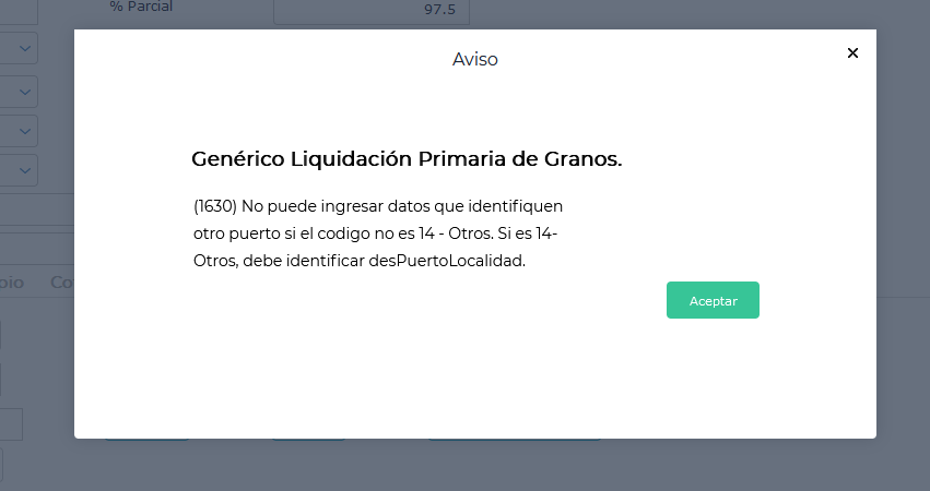 Genérica Liquidación Primaria de Granos (1630) No puede ingresar datos que identifiquen otro puerto si el código no es 14 - Otros. Si es 14- Otros, debe identificar desPuertoLocalidad.