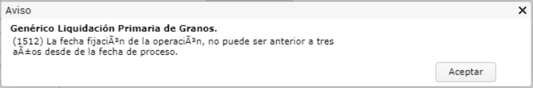 Al intentar obtener COE de una liquidación de compra de granos, el sistema devuelve un mensaje de error que indica: “Genérico Liquidación Primaria de Granos: (1512) La fecha fijación de la operación no puede ser anterior a tres años desde la fecha de proceso”