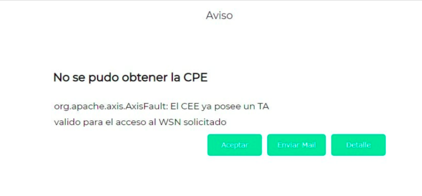 El sistema arroja el mensaje de advertencia “org.apache.axis.AxisFault: El CEE ya posee un TA valido para el acceso al WSN solicitado". Cuando se quiere obtener CPE de un Traslado de Venta de Granos.
