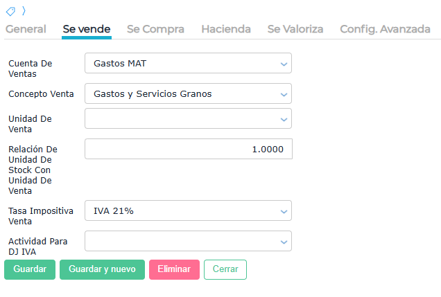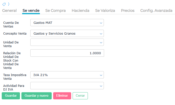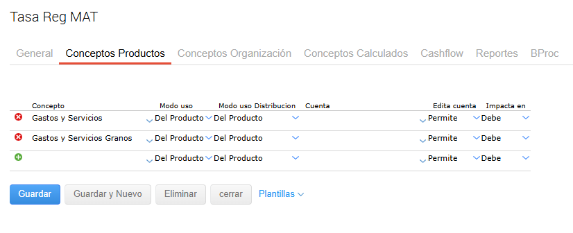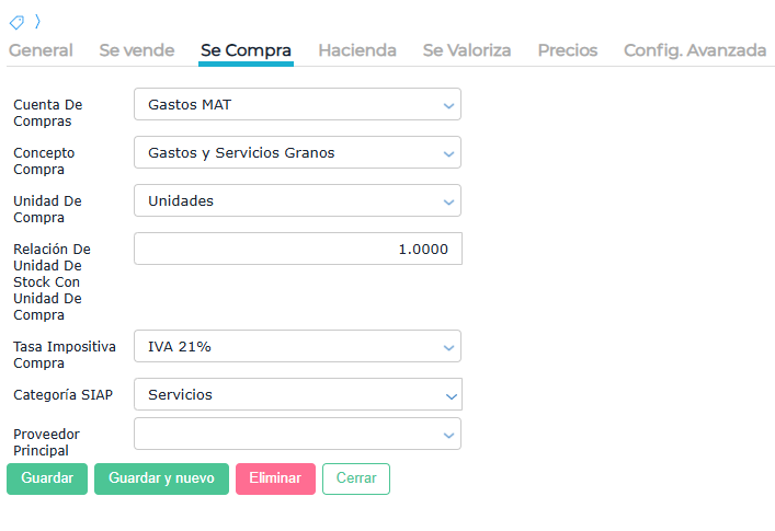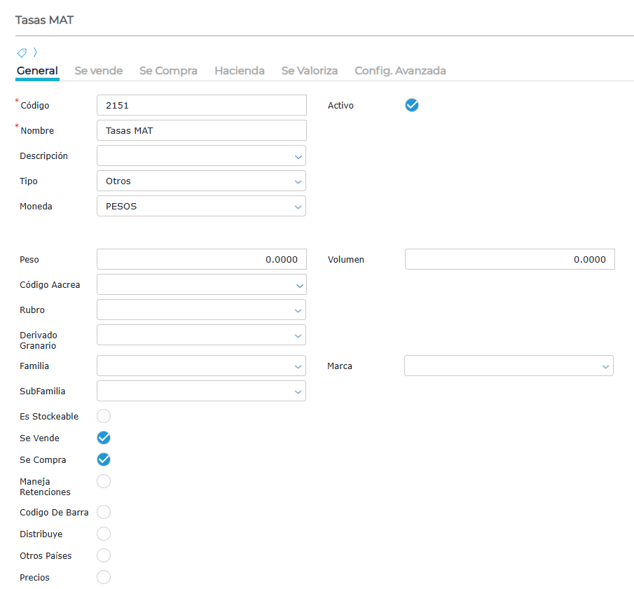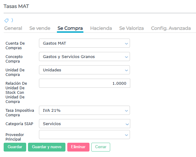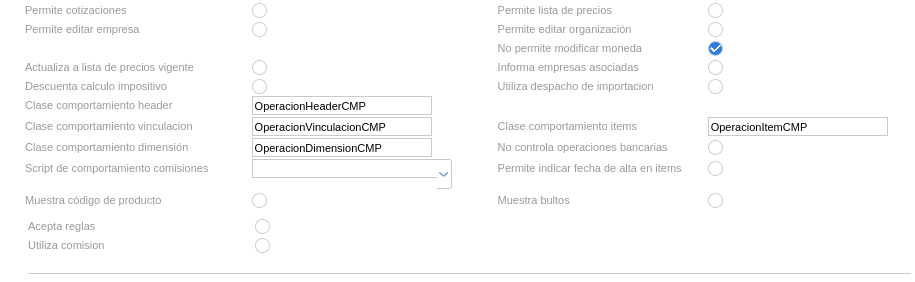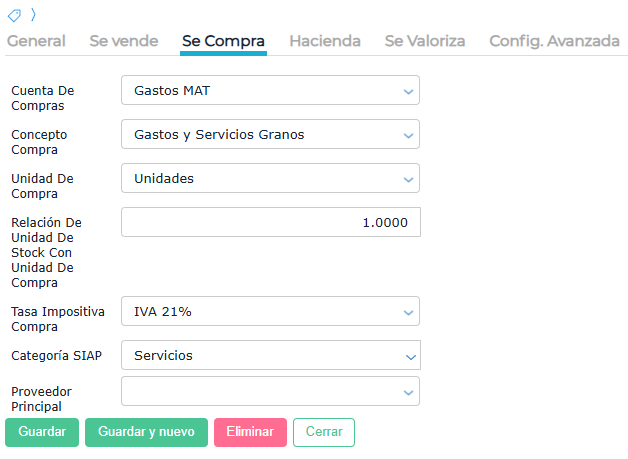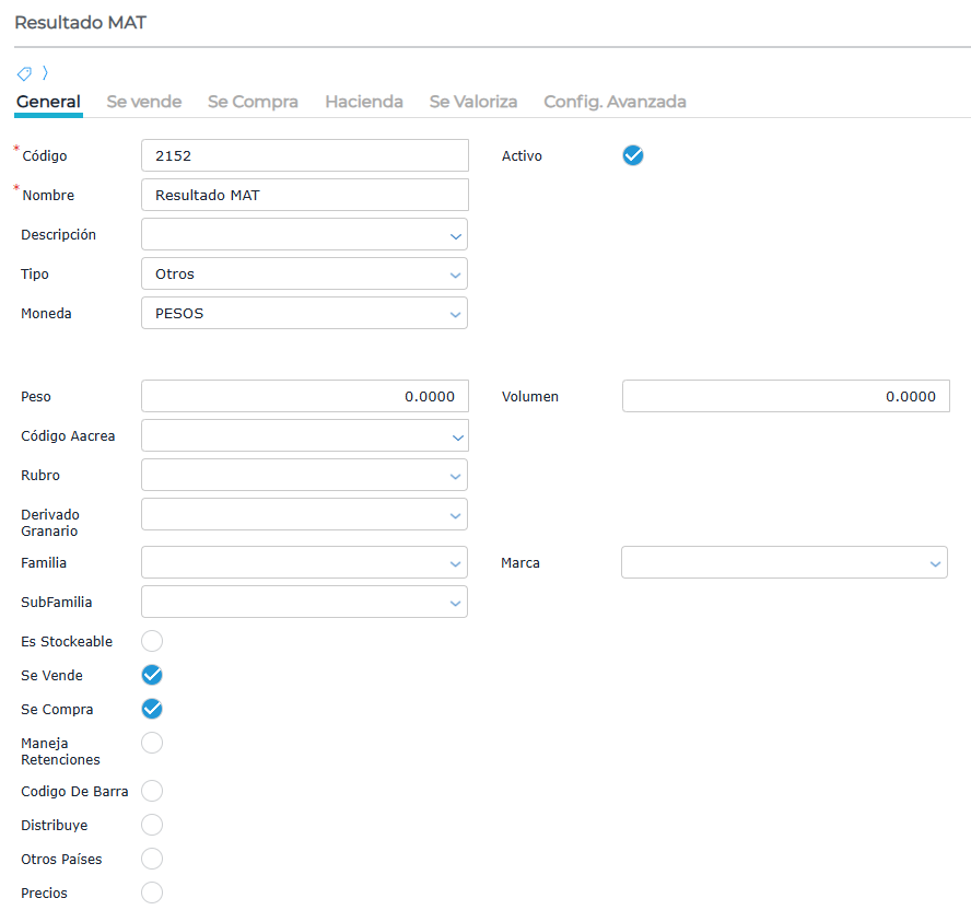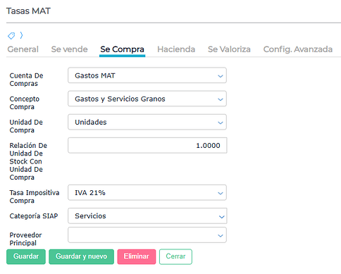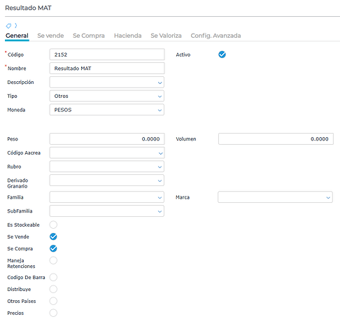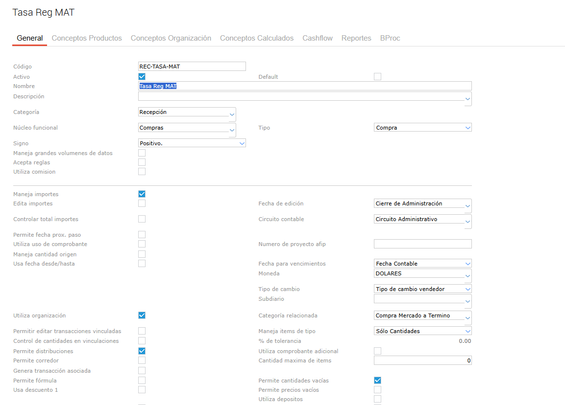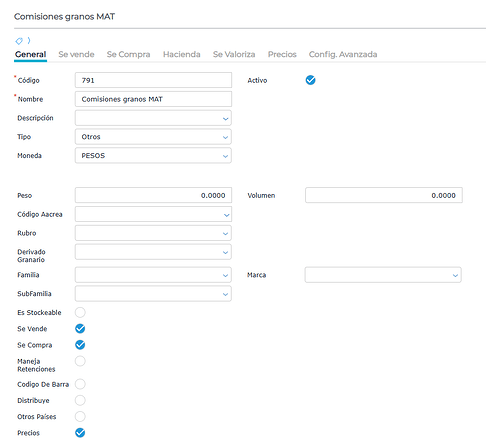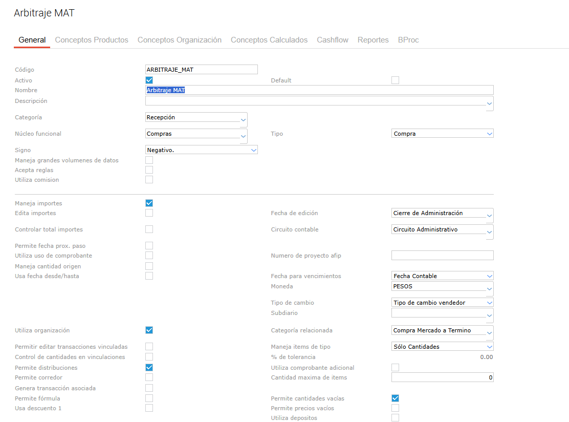 Al igual que con la venta, este documento tiene una categoría especial y debe configurarse para no impactar en stock ni contabilidad. Tampoco debe utilizar conceptos calculados (para no generar el IVA del producto grano)