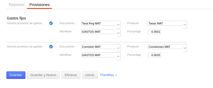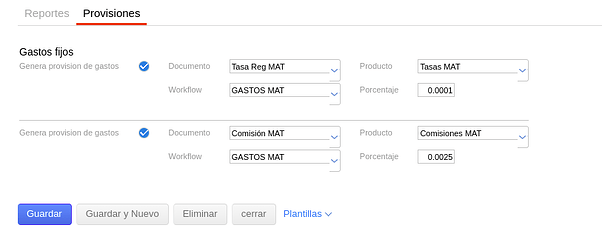 Para esto es necesario crear documentos del tipo “recepción” y productos para cada gasto que se quiera configurar. También se debe indicar el % del gasto y un workflow para indicar el circuito de las provisiones.