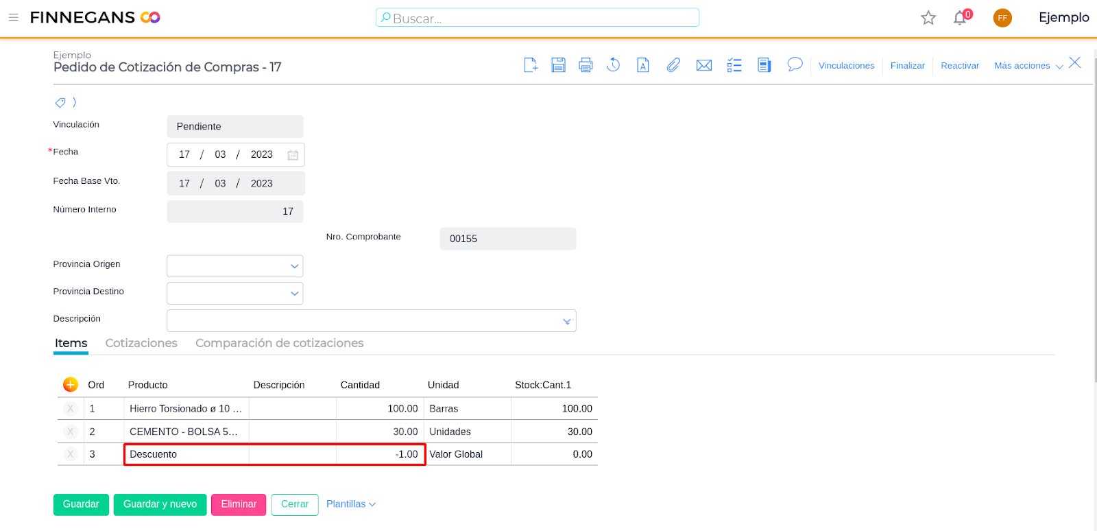 Al momento de cargar el producto “Descuento” en el pedido de cotización debe de indicar la cantidad en positivo y el valor cargarlo con signo negativo.