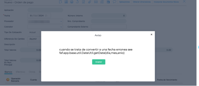 Al querer cargar una orden de pago con o sin asistente y seleccionar un proveedor surge el siguiente aviso: