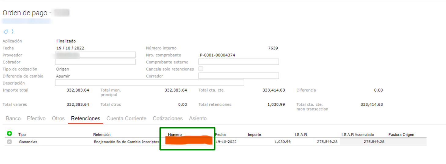 En la empresa X, las retenciones aplicadas en las órdenes de pago no se enumeran a pesar de tener el talonario asignado por empresa.