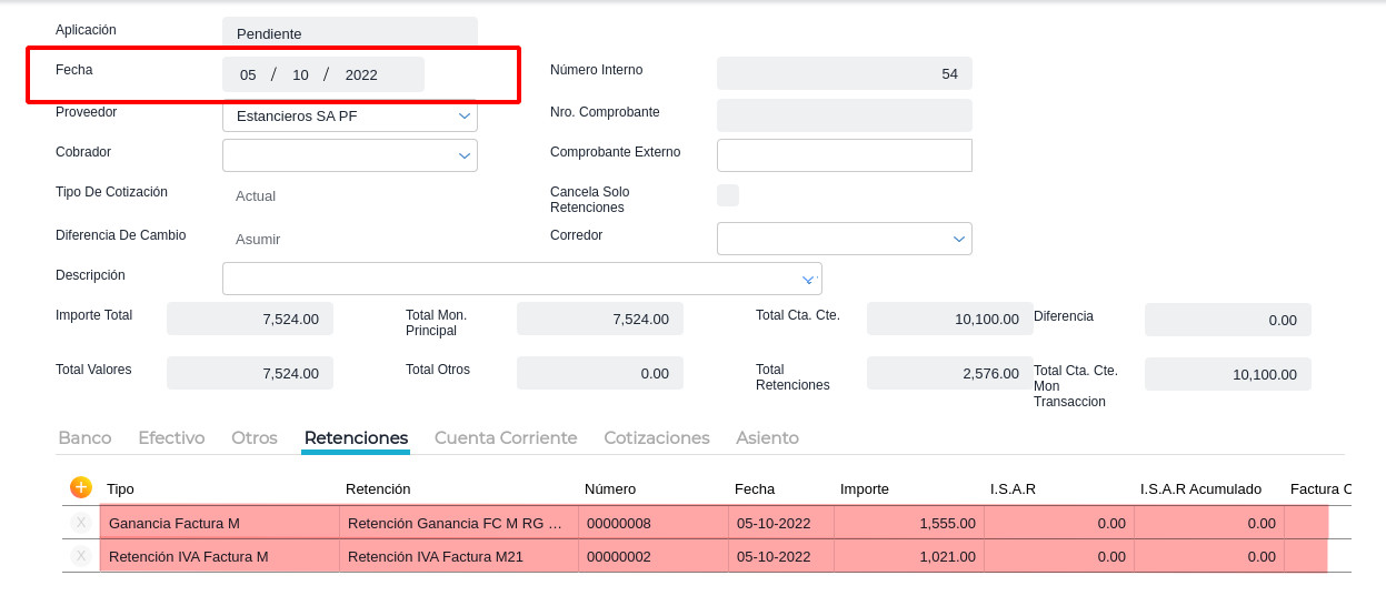 Al generar una orden de pago con retención, una vez que se guarda, el sistema no permite la edición de la fecha. En caso de guardar una orden de pago sin retención, el sistema permite modificar dicha fecha y reguardar.