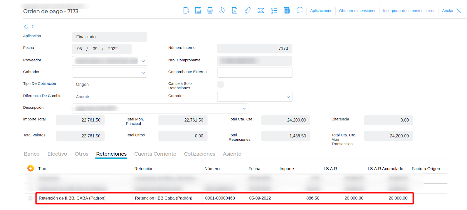 - Por último, verificar en la Orden de Pago que el cálculo de retención se esté haciendo correctamente.