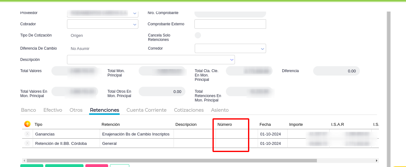 Al generar una Orden de Pago, las retenciones no se enumeran.