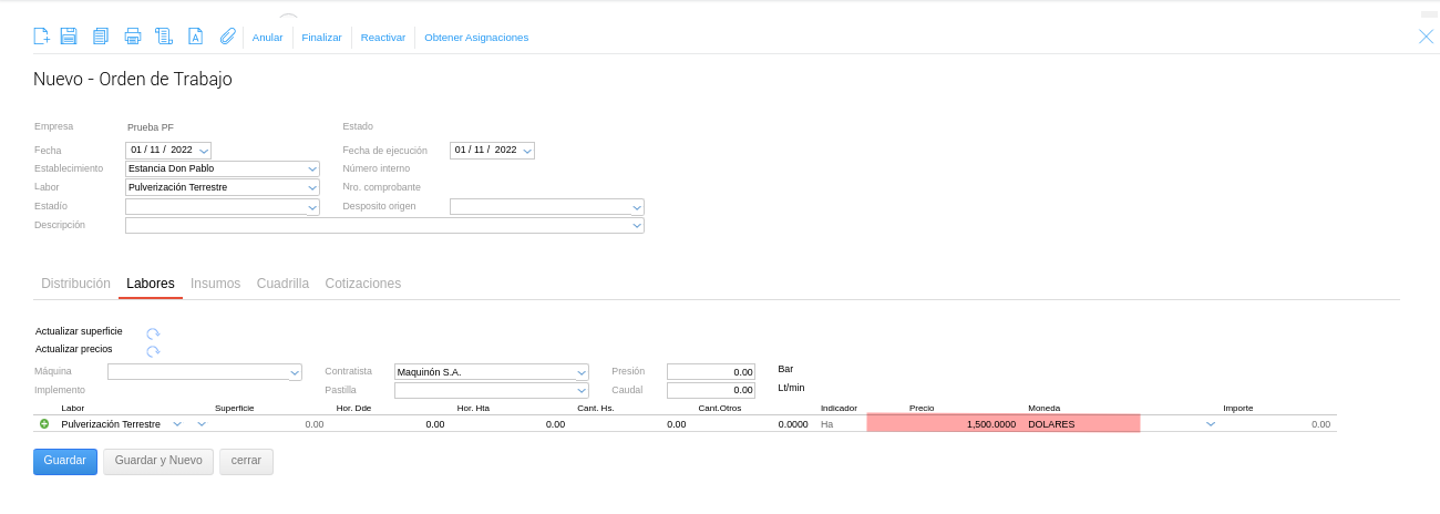 4- Al cargar la labor en la Orden de Trabajo, se pesifica automáticamente.