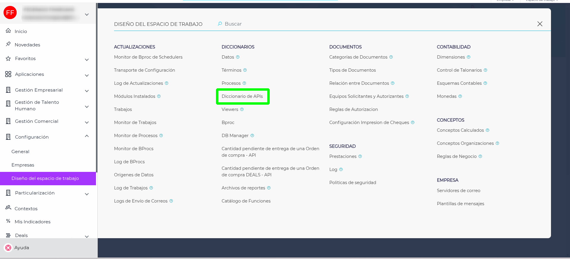 Dirígete a Configuración → Diseño del Espacio de Trabajo → Diccionario de APIs.
