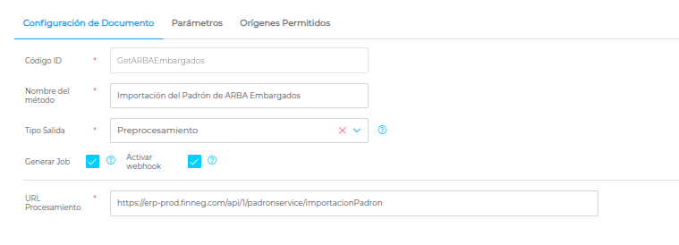 Al ingresar al mismo, y dirigirnos a la solapa “Configuración de Documento” vemos que el sistema trae por default los campos completos. Los checks “Generar Job” y “Activar webhook” deben dejarse activos.