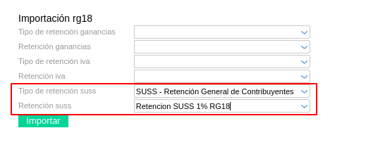 En el importador crear los selectores SUSS. Se denominan “Tipo de retención suss” y “Retención suss”