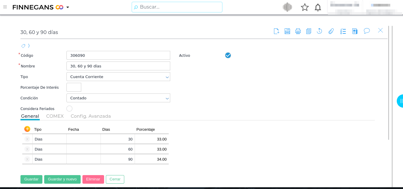 Menú → Gestión Empresarial → Tesorería → Condiciones de Pago