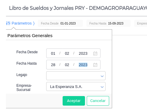 - Completar los parámetros con la fecha correspondiente al período a emitir. Por ejemplo si deseo emitir Febrero la fecha a completar debe ser por el mes completo