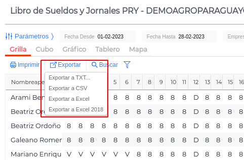 - Se visualizará el detalle a exportar en grilla de la siguiente manera: