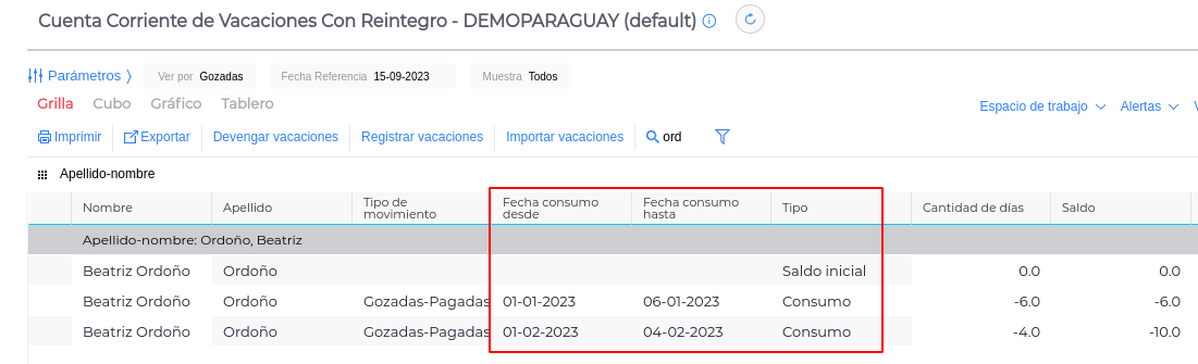 Para poder representar los días de licencia como vacaciones dentro del libro, los días deben estar registrados en la view “Cuenta Corriente de vacaciones con reintegro ”