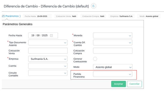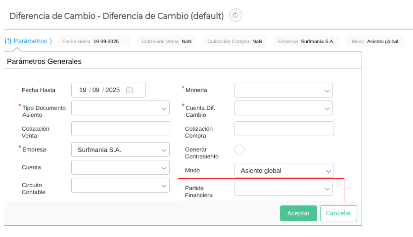 Nuevo Parámetro: Se agregó un campo opcional llamado “Partida Financiera” en la pantalla de configuración del proceso de Diferencia de Cambio (tanto para moneda principal como secundaria)