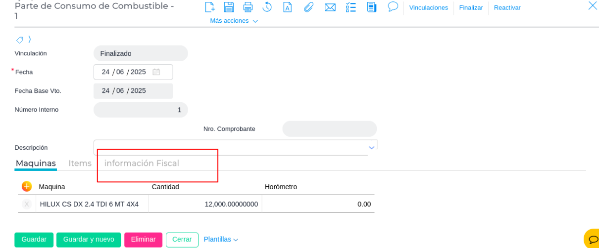 El Parte de Consumo de Combustible generado no contiene información fiscal. Por ese motivo, al intentar previsualizar el imprimible correspondiente al Asiento de Valorización, el PDF no muestra datos, ya que no hay información que visualizar. Esto explica por qué el sistema emite un cartel de advertencia al momento de intentar generar el archivo.