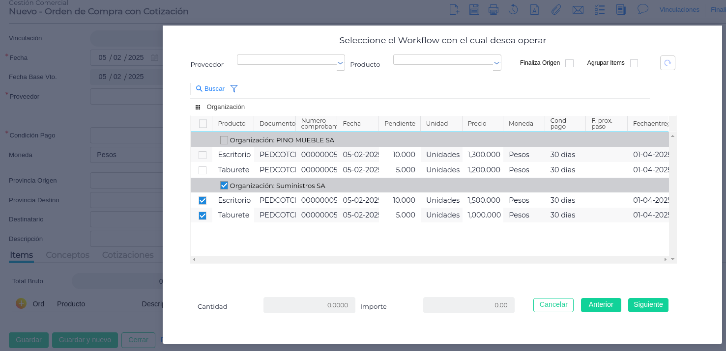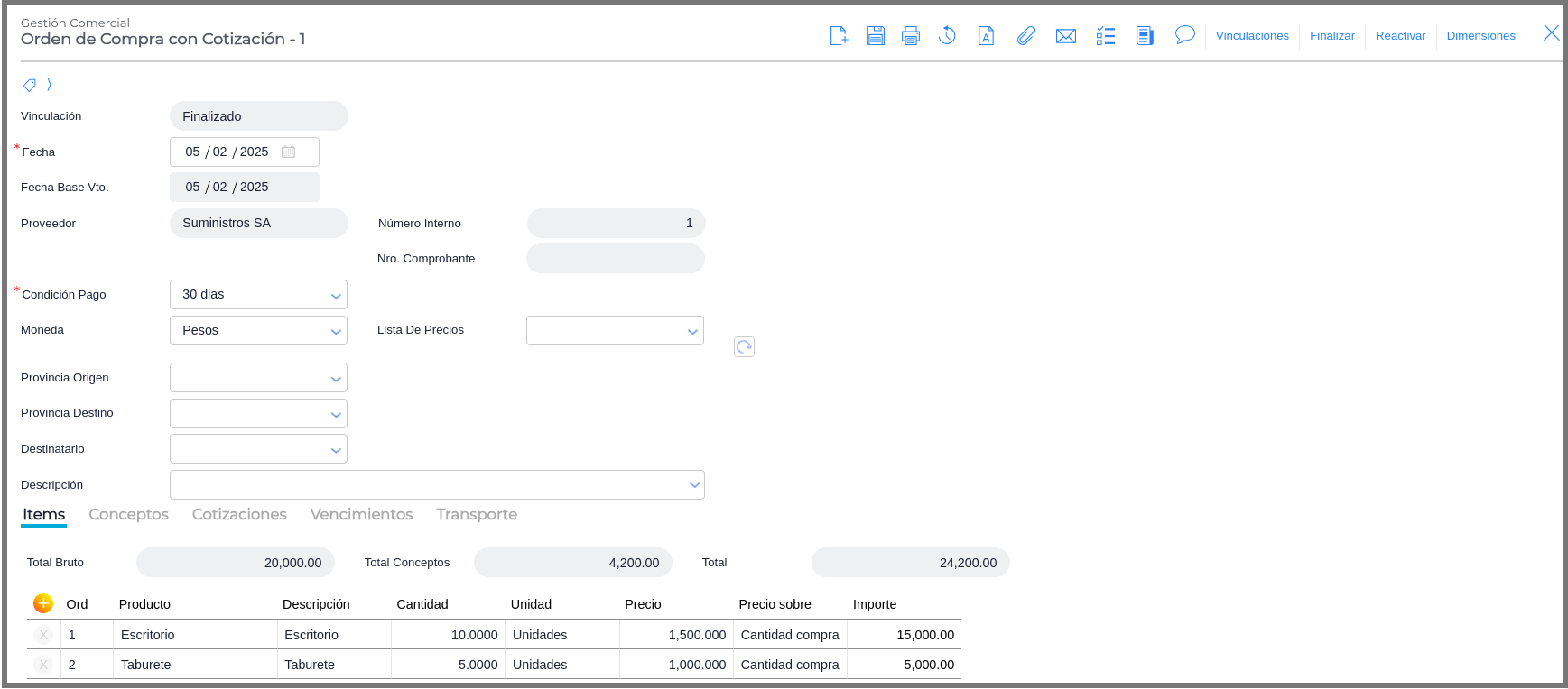 El circuito finaliza con la registración de la Orden de Compra, donde mediante un asistente es posible seleccionar los pedidos de cotización pendientes.