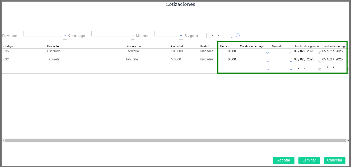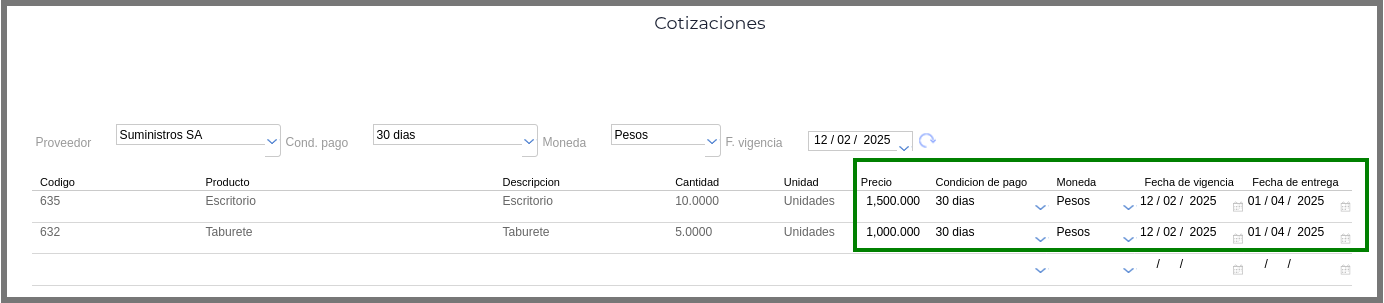 Una vez recibidas las cotizaciones de cada proveedor, se actualizan los precios y condiciones en cada pedido de cotización.