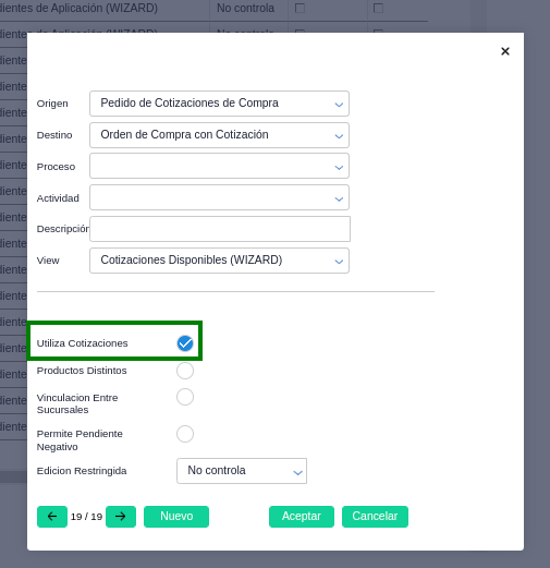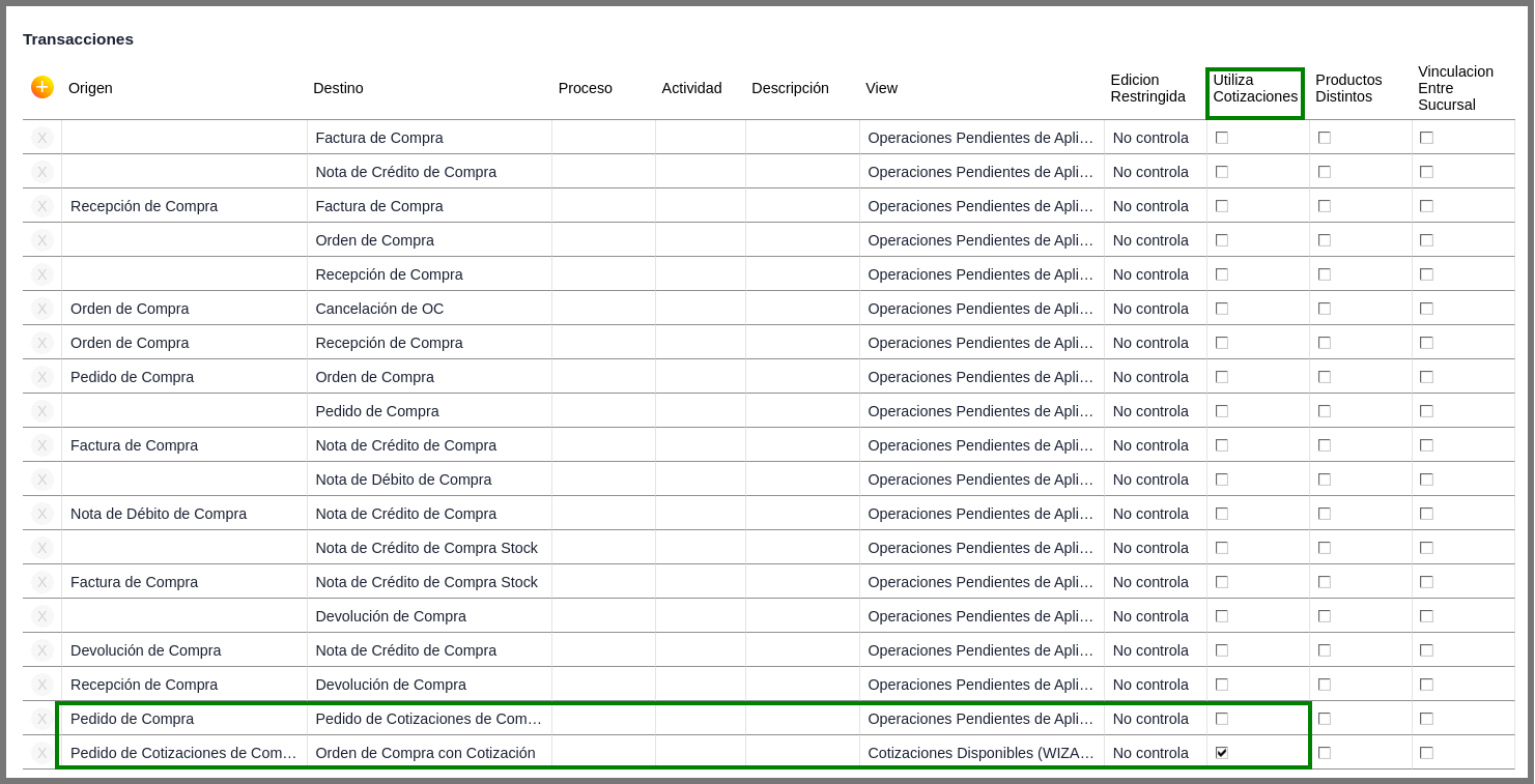 Se deben respetar las siguientes configuraciones para la transición Pedido de Cotizaciones de Compra → Orden de Compra: