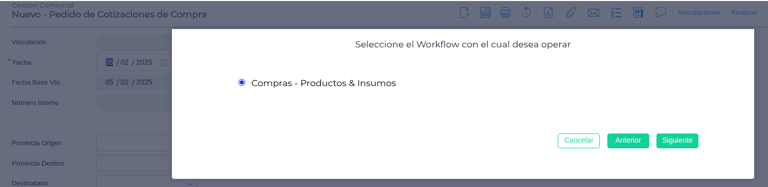 Esta funcionalidad permite la registración de los Pedidos de Cotizaciones de Compra, a partir de las solicitudes de compra previamente registradas por los distintos sectores de la empresa.