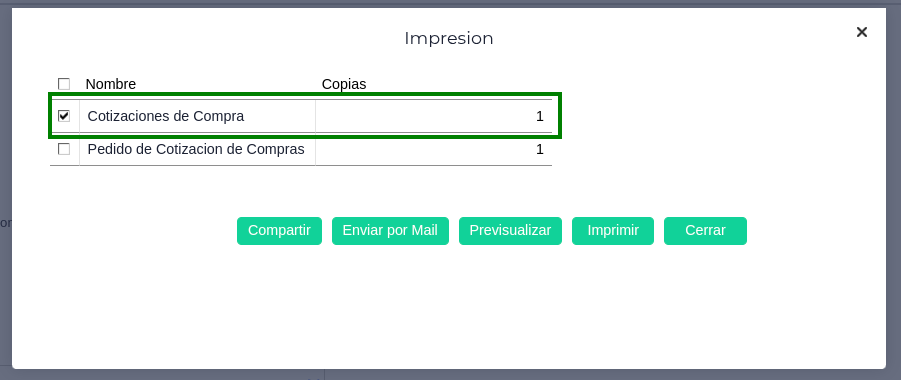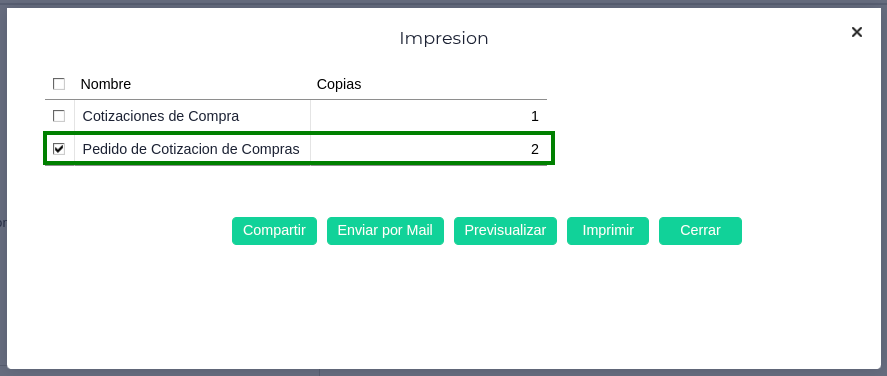 Para ello se debe presionar el botón Imprimir de la barra de herramientas, y luego seleccionar el reporte Pedido de Cotización de Compra. Se indica la cantidad de copias en función a la cantidad de proveedores a los cuales se debe solicitar cotización.