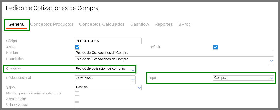 Categoría: se debe indicar Pedido de Cotización de Compras.