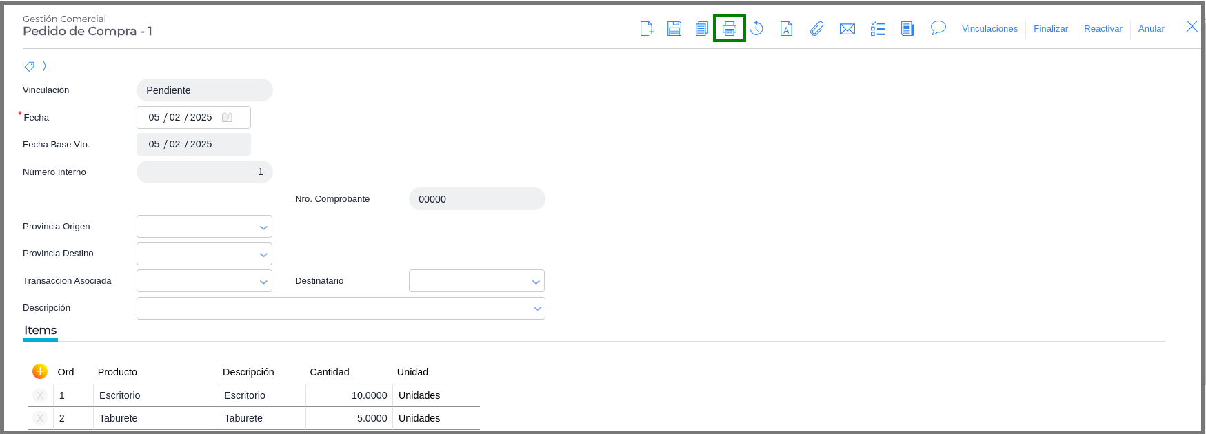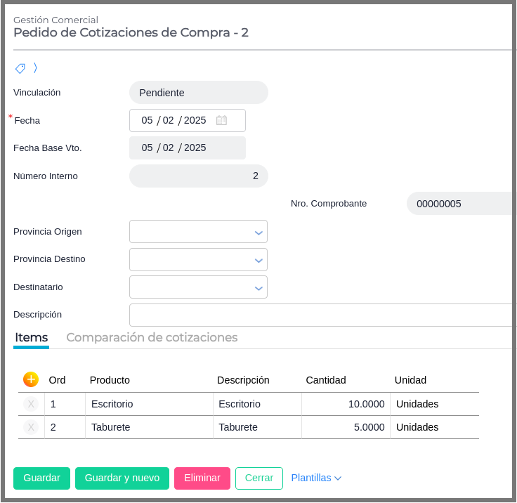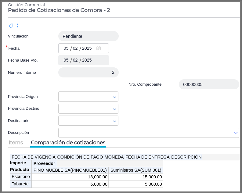 Una vez guardada la operación, se emite el Pedido de Cotizaciones para enviar a los distintos proveedores.
