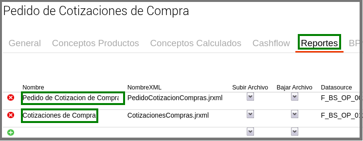 En esta solapa se configuran los reportes de impresión disponibles para el tipo de documento Pedido de Cotizaciones de Compra.