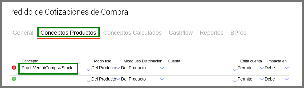 En esta solapa se configurarán los conceptos de productos a utilizar en este tipo de documento. A partir de los conceptos de productos, se podrá restringir qué productos se podrán visualizar y seleccionar al momento de generar una nueva transacción.
