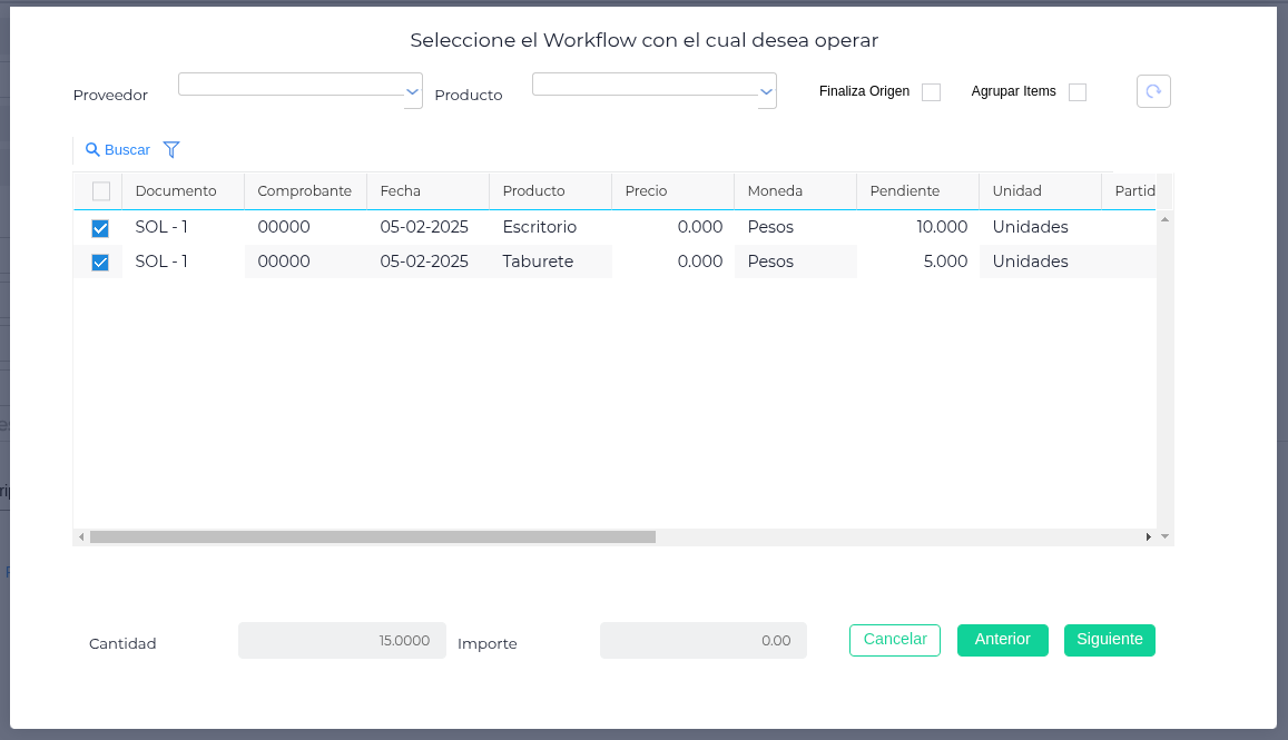 Al hacer clic en Siguiente, el asistente muestra todas las solicitudes de compra pendientes.