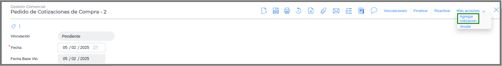Para cargar las cotizaciones enviadas por los proveedores, se debe ingresar a la edición de cada pedido de cotización y presionar el botón Agregar Cotización ubicado en la barra de herramientas.