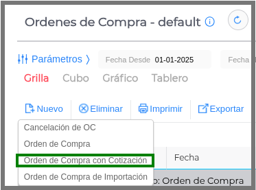 Al presionar el botón Nuevo, se debe elegir el documento Orden de Compra Con Cotización.