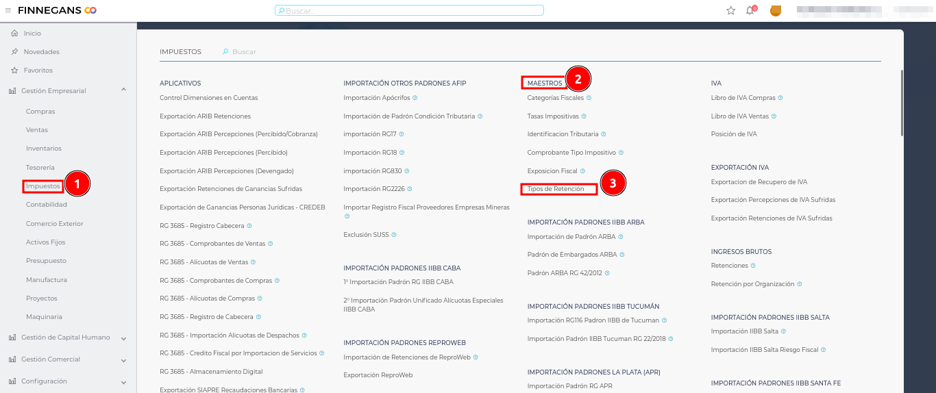 - Se accede desde el menú → Gestión empresarial → Impuestos → En la columna de maestros ingresamos a Tipos de Retención.