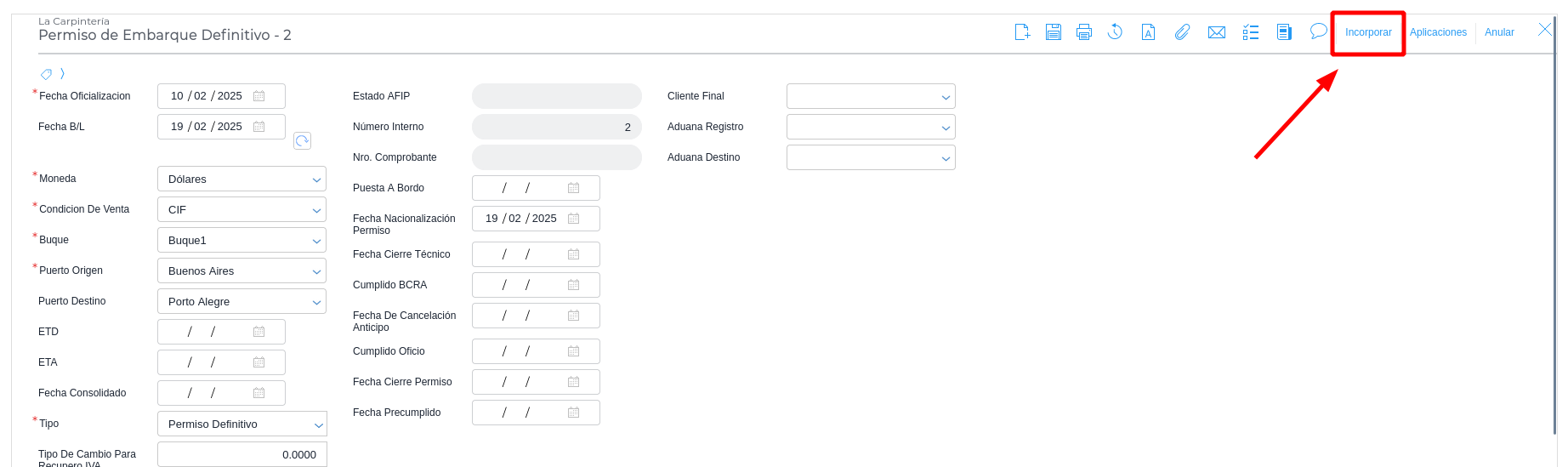 Para que permita incorporar facturas dentro del Permiso de Embarque Definitivo, el Tipo tiene que ser “Permiso Único”.