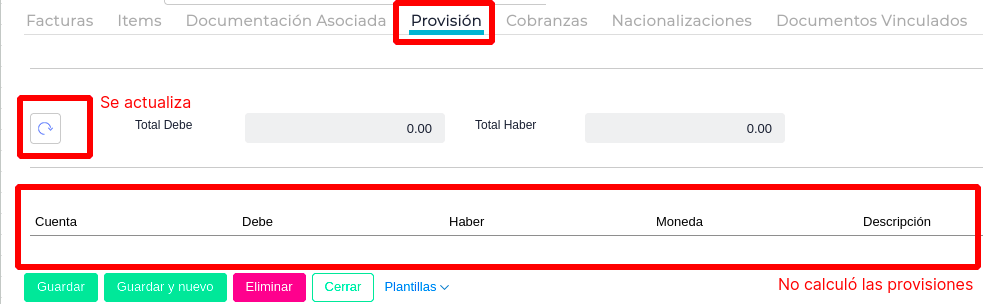 Al cargar permiso de embarque, luego de darle al botón actualizar en la solapa Provisiones, no calcula las mismas.