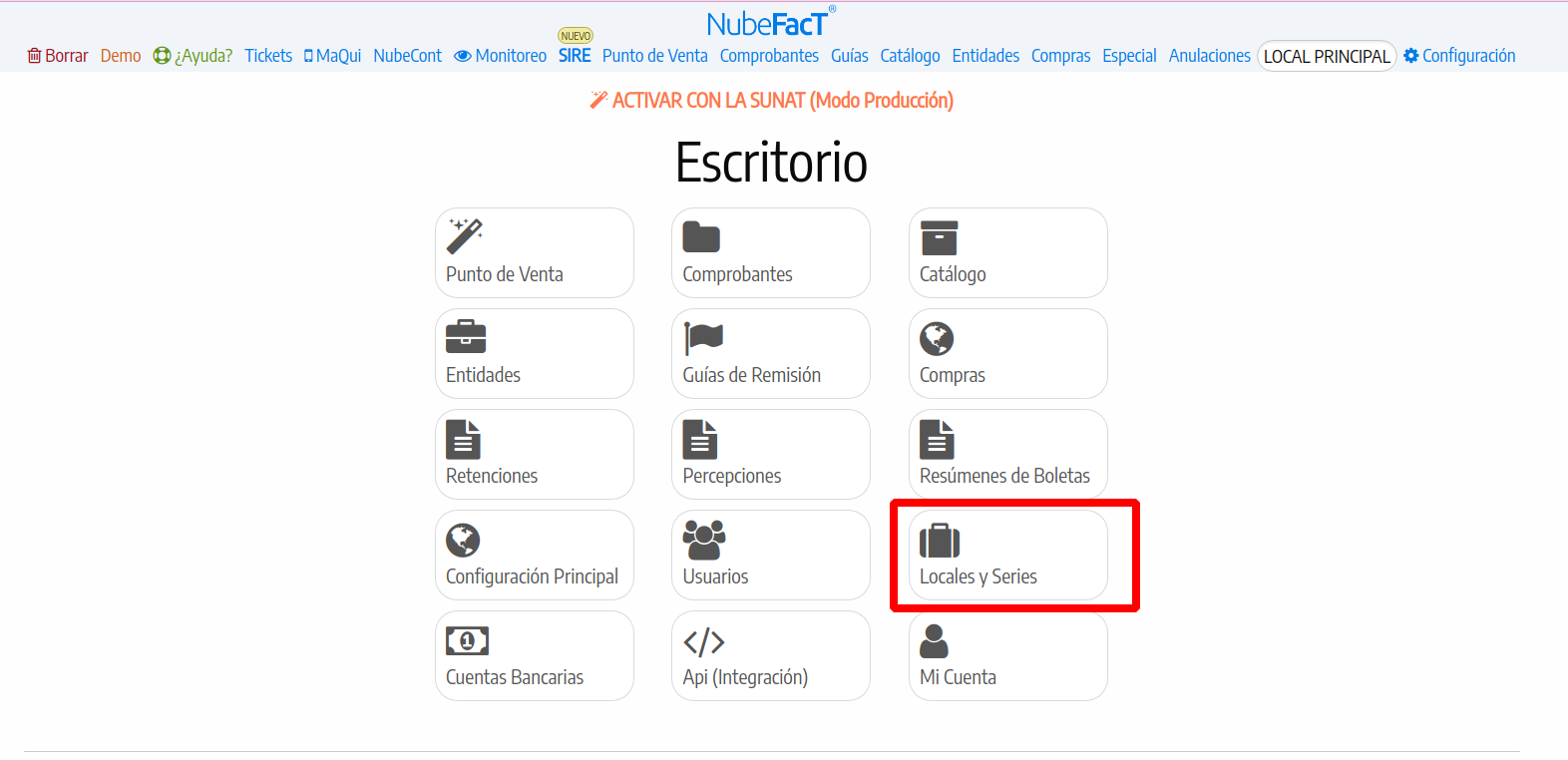 - Ingresar en Nubefact con su usuario y en el escritorio selecciona Locales y series