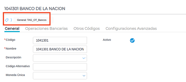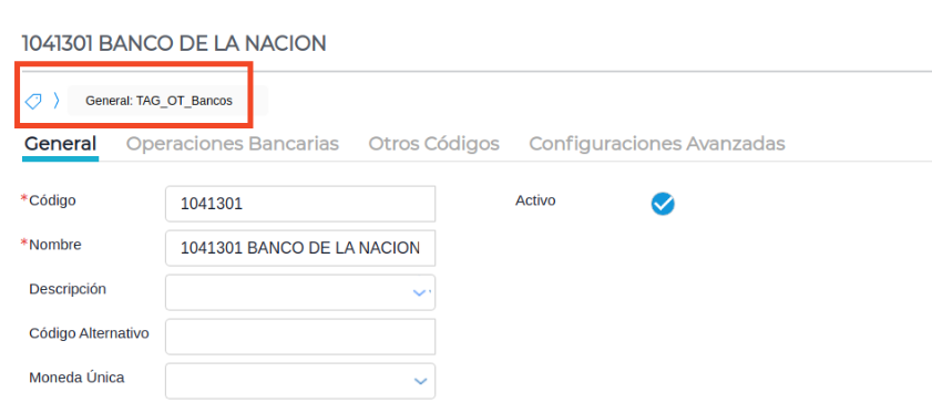 - En el Maestro de Cuentas, indicar a las cuentas de Bancos (104) el tag: TAG_OT_Bancos