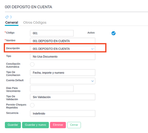 - En el Maestro de Operaciones Bancarias, completar el campo descripción con la descripción de la operación bancaria.