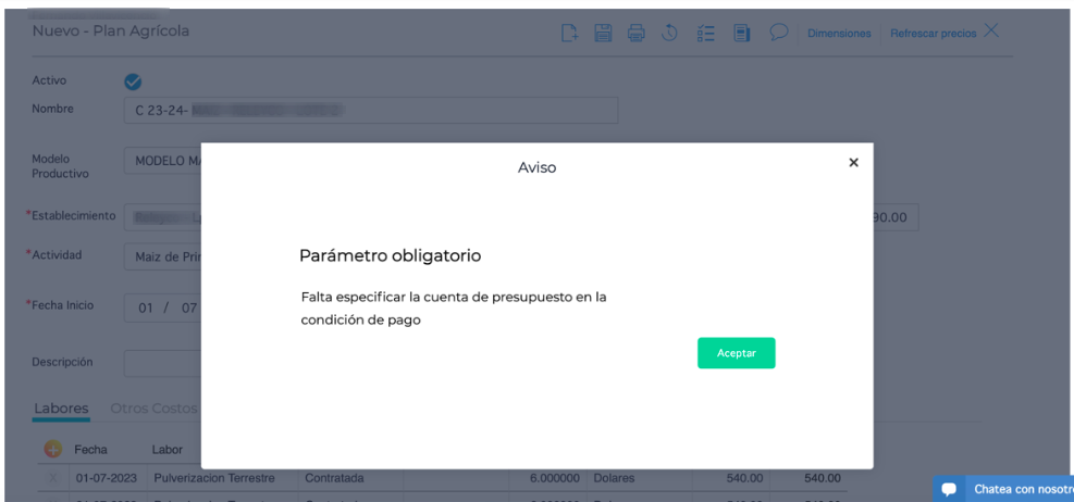 Al momento de crear un plan agrícola y guardarlo, el sistema arroja el siguiente error: “Falta especificar la cuenta en la condición de pago”