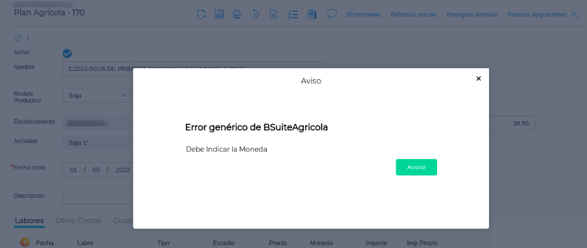 Al cargar un Plan Agrícola, el sistema arroja el siguiente error: